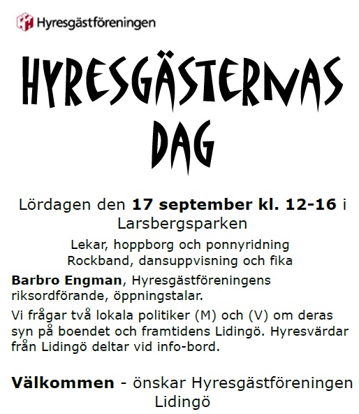 Lördagen den 17/9 arrangeras Hyresgästföreningens dag i Larsberg av Hyresgästföreningen Lidingö. Med anledning av detta arrangeras en debatt om bostadsmarknaden. Debatten leds av journalister och professionella utfrågare. Deltagarna i denna debatt kommer att vara två representanter från Lidingös politiska partier. Den ena av dessa är en representant för oppositionen och den andra för majoriteten. Majoriteten representeras av en moderat ungdomspolitiker och oppositionen av Vänsterpartiet Lidingös ordförande Ida Luther Näsholm.