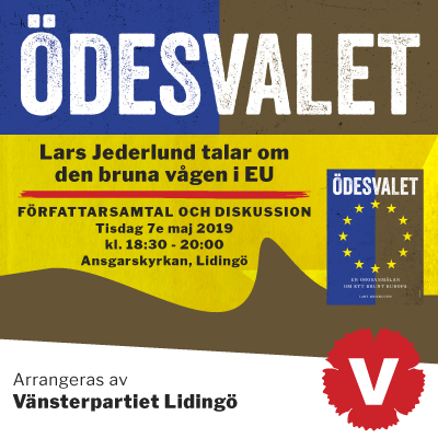 I EU-parlamentet sitter bland andra National (fd Front National, med 22% stöd i opinionen), Italienska Lega (36%), ungerska Fidesz (51%), polska PiS (405), tyska AfD (14%) och Österrikiska FPÖ (23%), Gyllene Gryning (8%), ungerska Jobbik (15%) och Vårt Slovakien (12%). Hur bromsar vi den bruna vågen i Europa? I sin bok ”Ödesvalet – en orosanmälan om ett brunt Europa” diskuterar författaren Lars Jederlund utvecklingen.